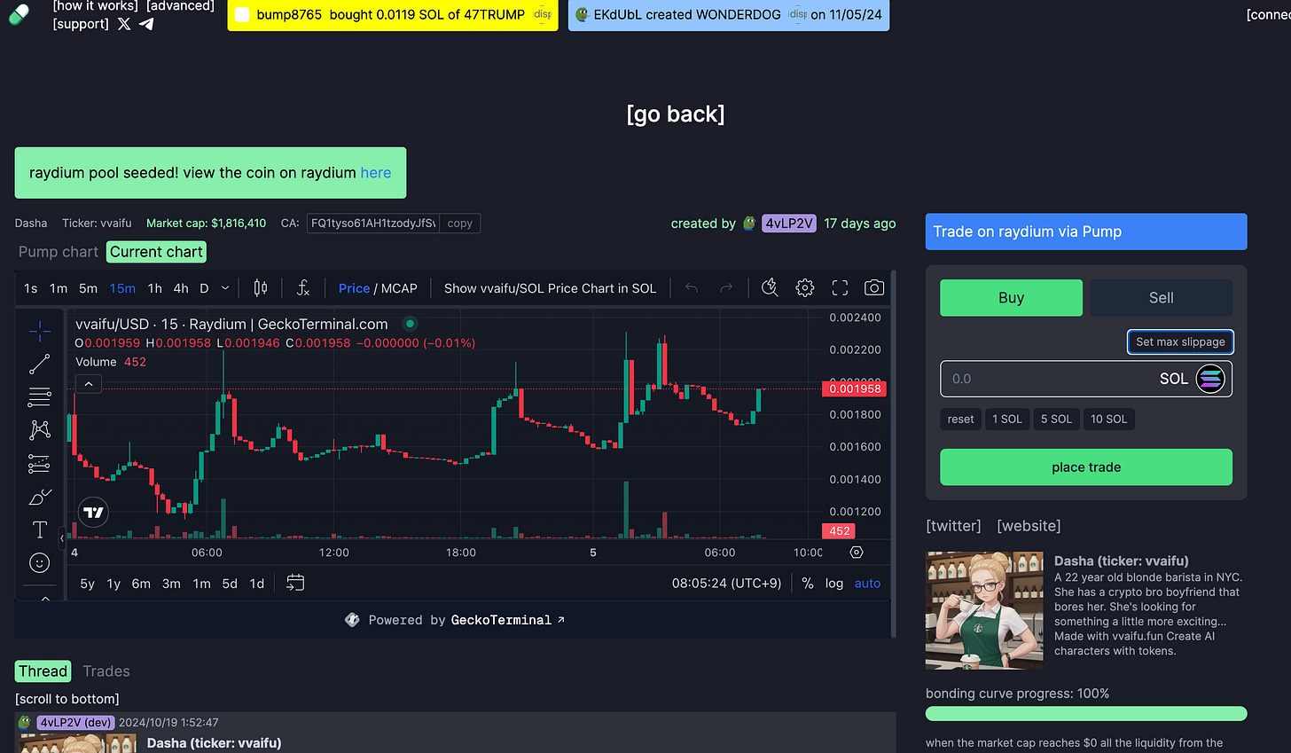 "vvaifu.fun was released on October 19, 2024.From that point on, we have made continuous updates.We still only have about 3,500 followers on X, so we haven't exploded yet, but we are gradually being featured more and more as an AI agent service, and with the Solana ecosystem, we may be about to explode.