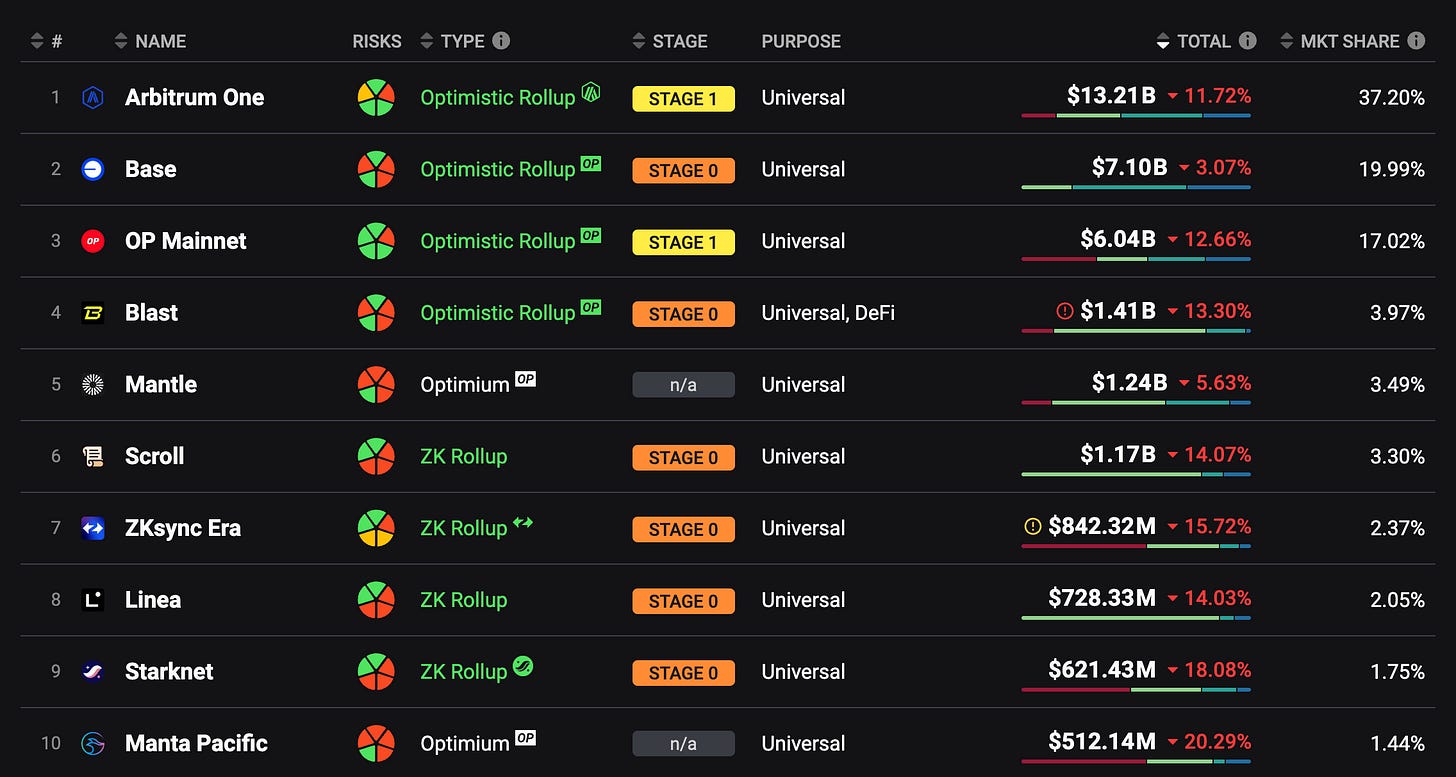 Base currently leads in daily transaction volume, with Arbitrum in second place.