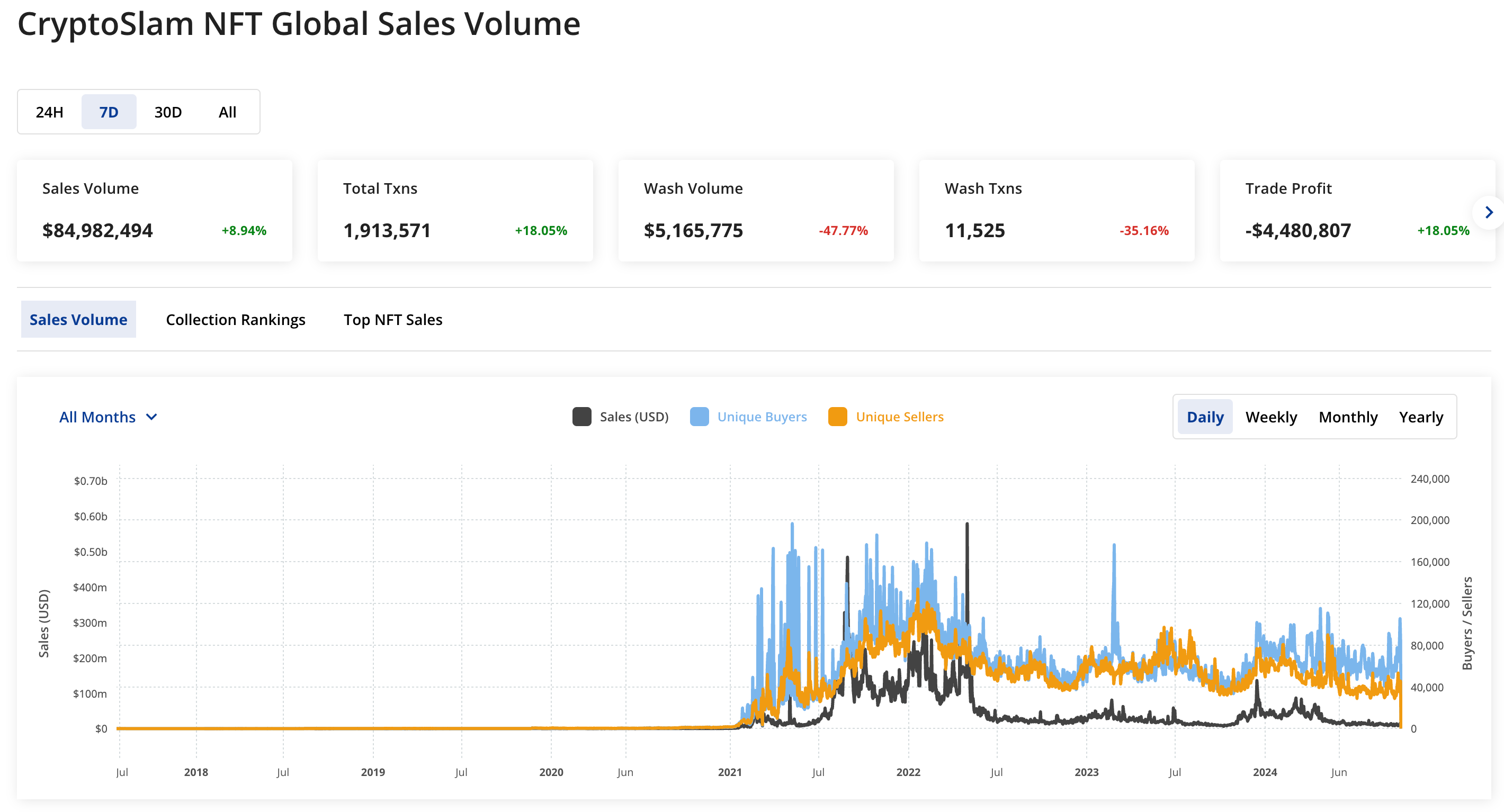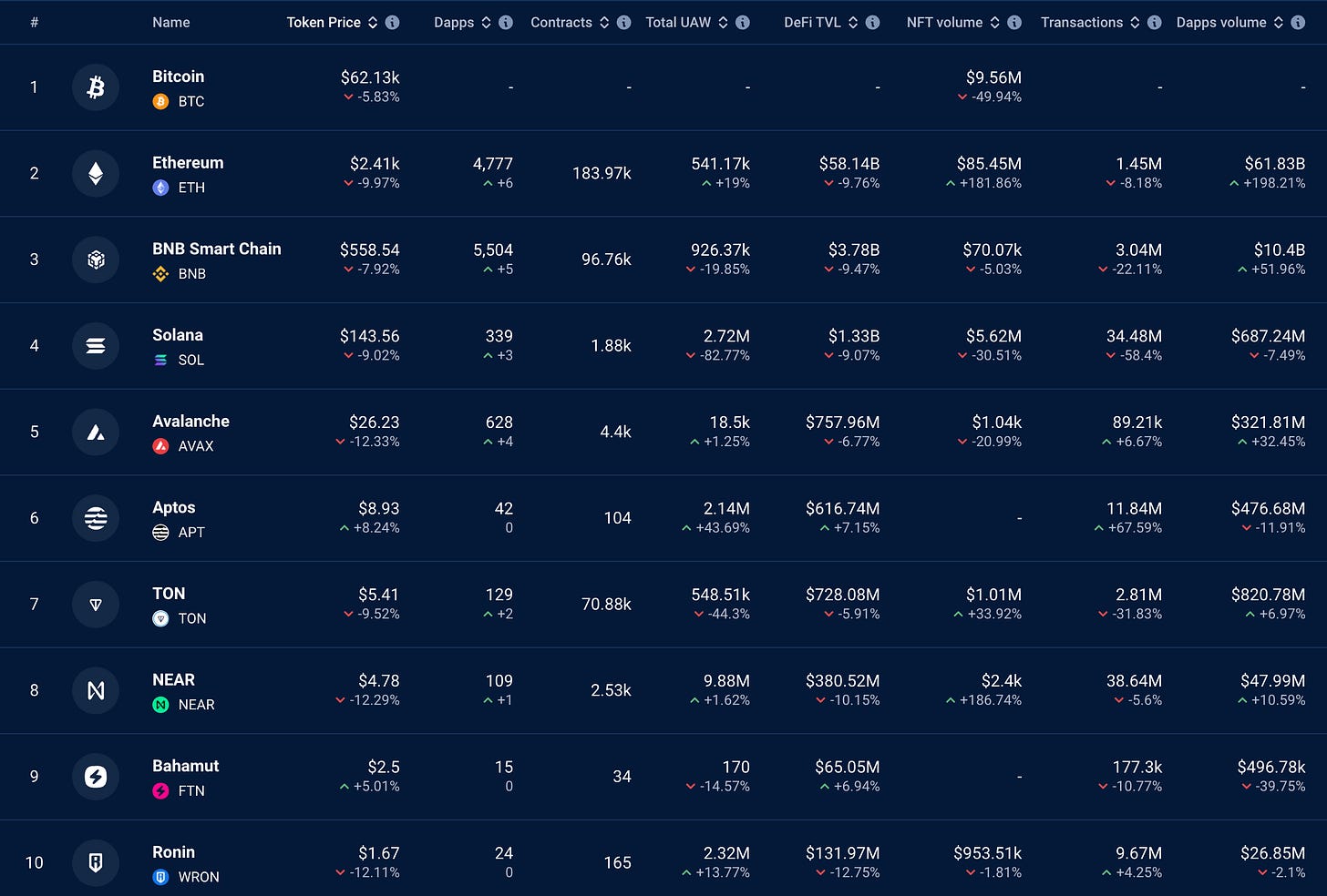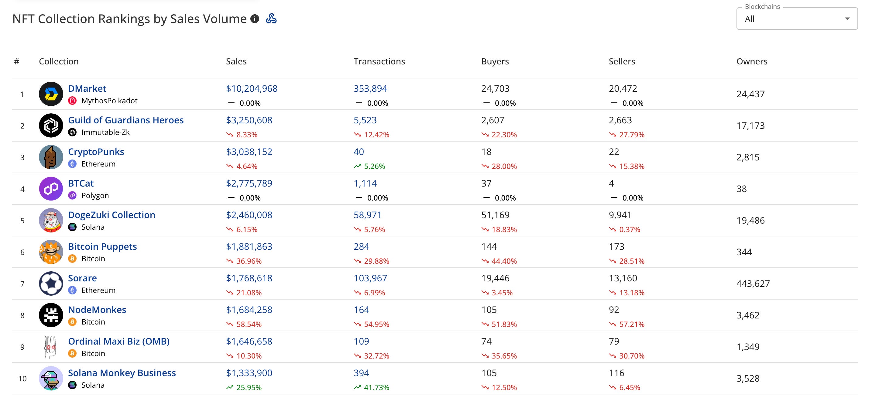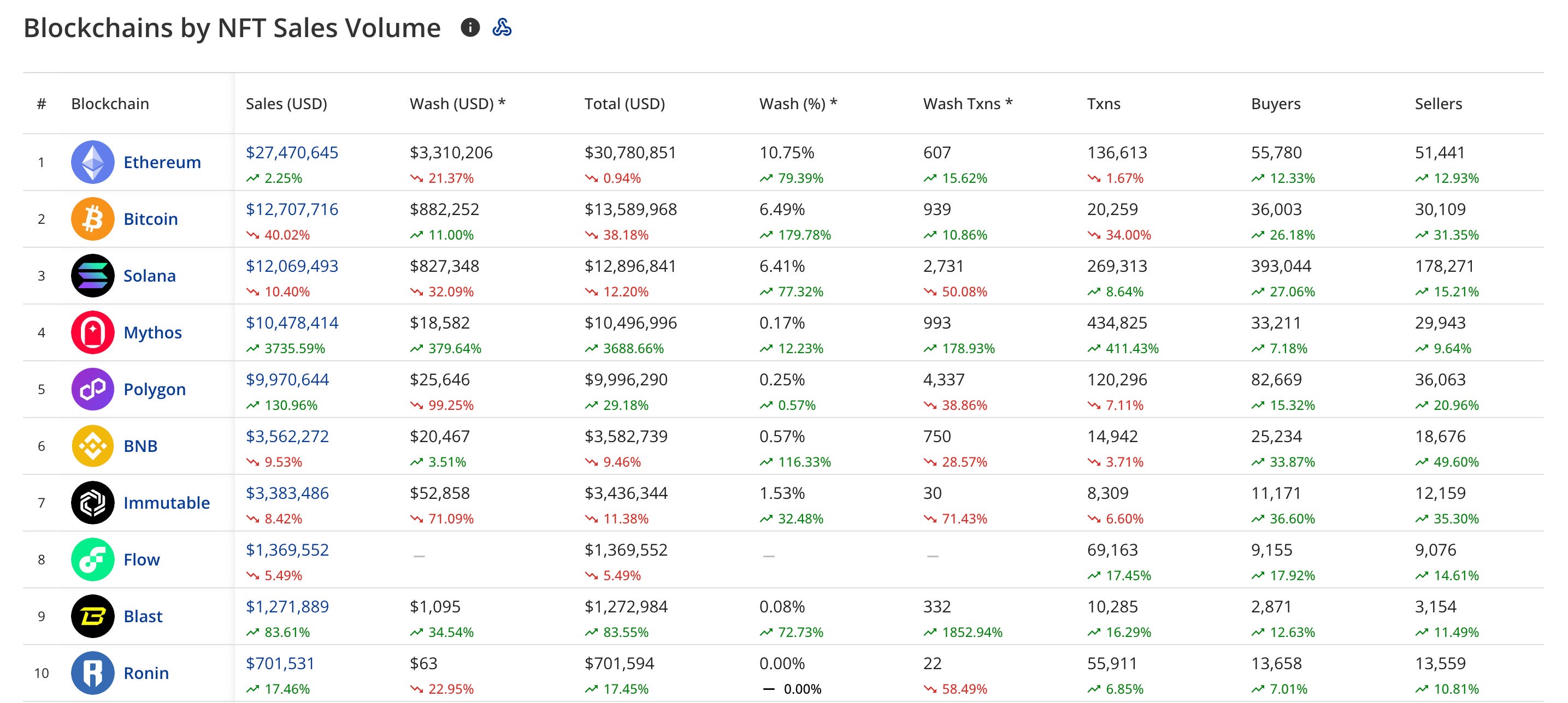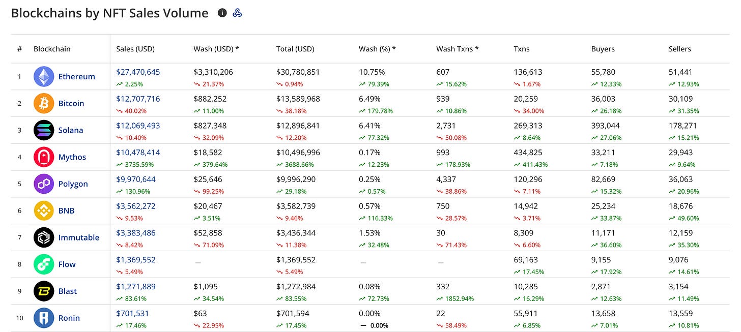 Transaction volume is rising.On a per chain basis, Polygon, Mythos and Blast are showing an increase.